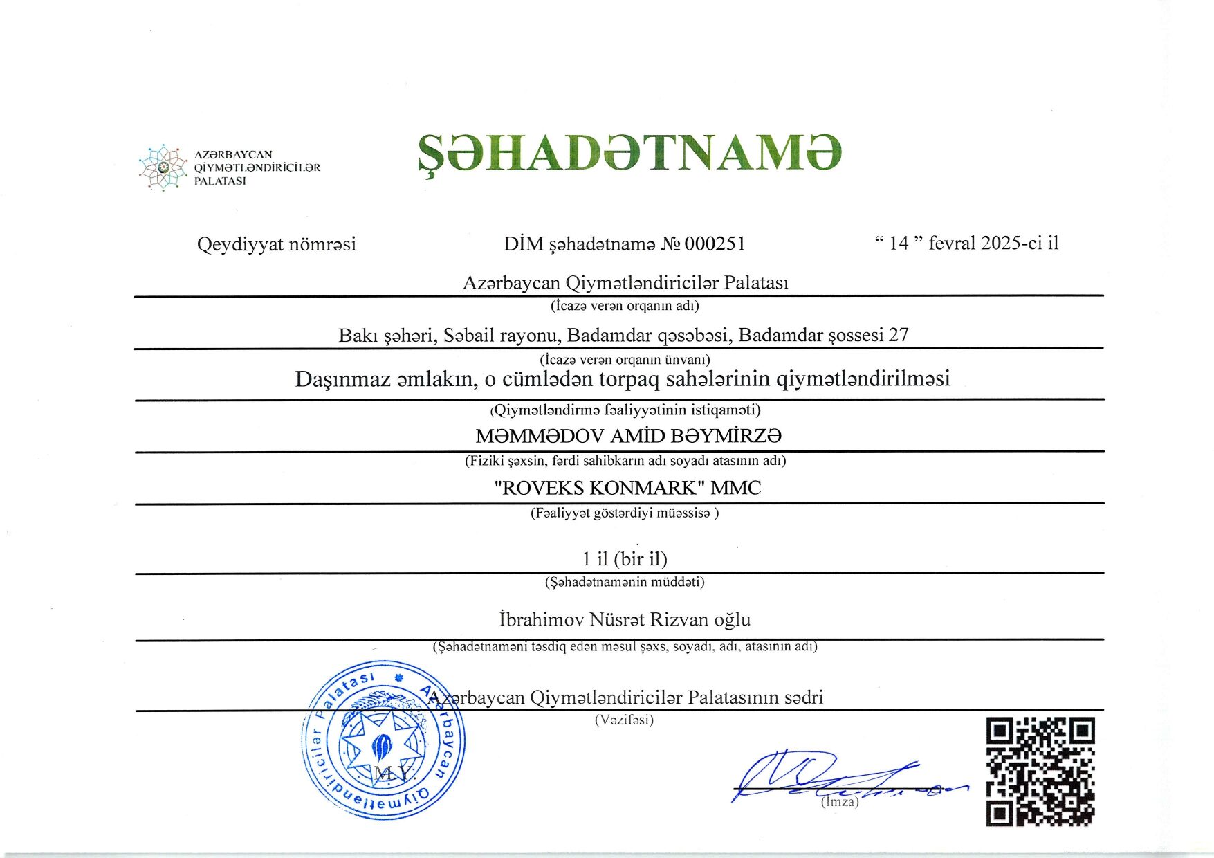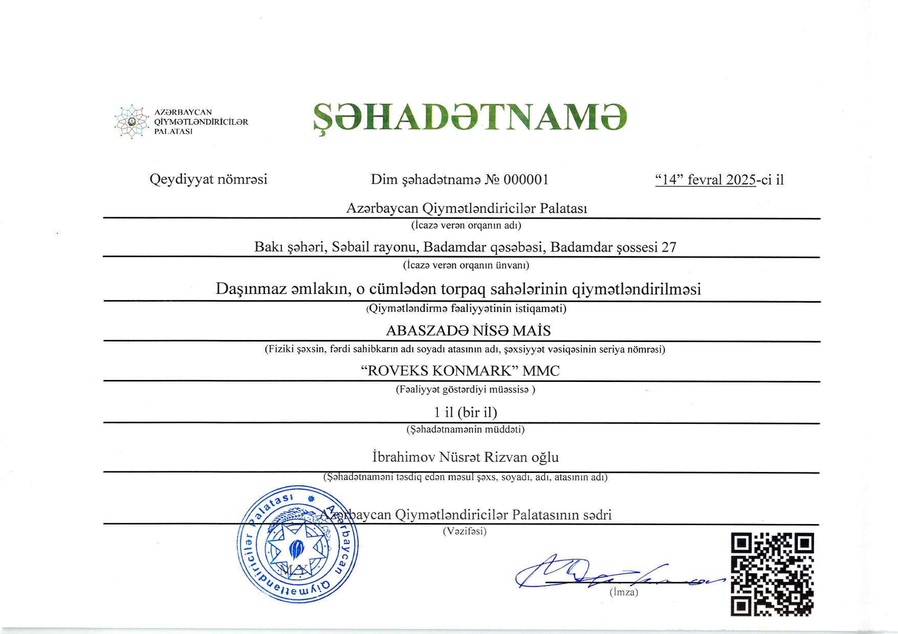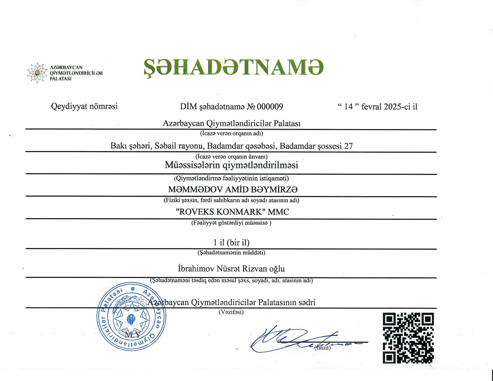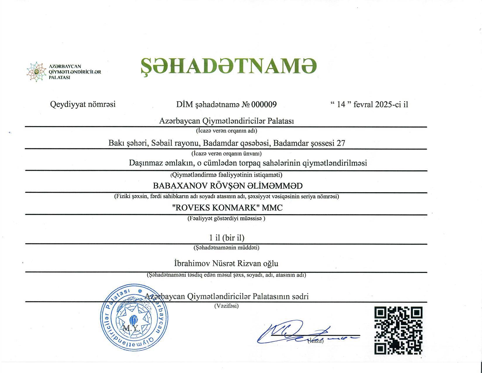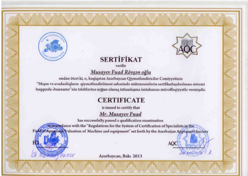 Bu gün mən şirkətin əməkdaşları ilə işgüzar münasibət qurmağa nail olmuşam, belə ki, Rovşan Babaxanovun yaxşı nəticələr ilə Beynəlxalq Maliyyə Korporasiyası və Azərbaycan Qiymətləndiricilər Cəmiyyəti tərəfindən keçirilmiş professional qiymətləndiricilərin sertifikatlaşdırmasından keçməsi onun professional qabiliyyətinin yüksək olmasının göstəricisidir. Eyni zamanda, BMK tərəfindən layihə çərçivisində işə cəlb olunan şirkətin əməkdaşı olan Əli Məmmədovun yüksək analitik və riyazi biliklərə malik olmasını nümayiş etditmişdir və layihənin işini modelləşdirmişdir. Sizə gələcək fəaliyyətinizdə uqurlar arzu edirəm.