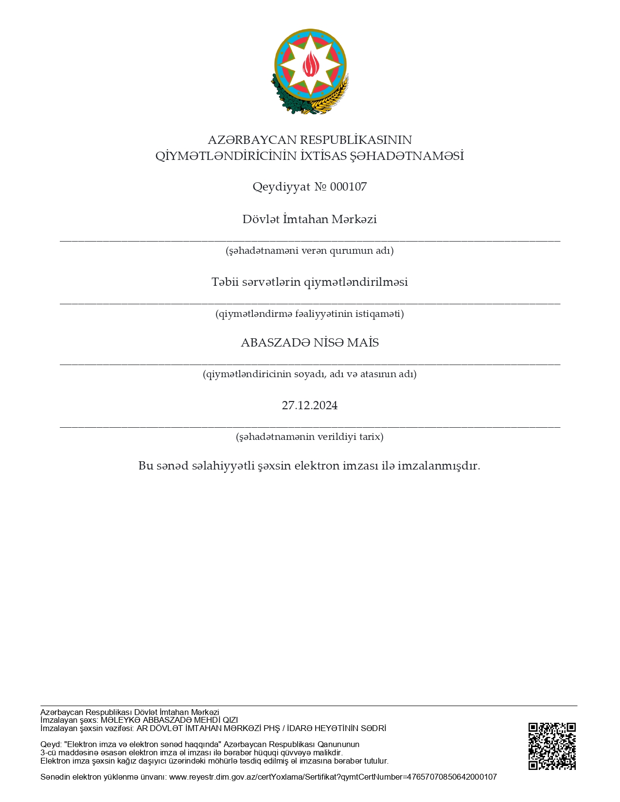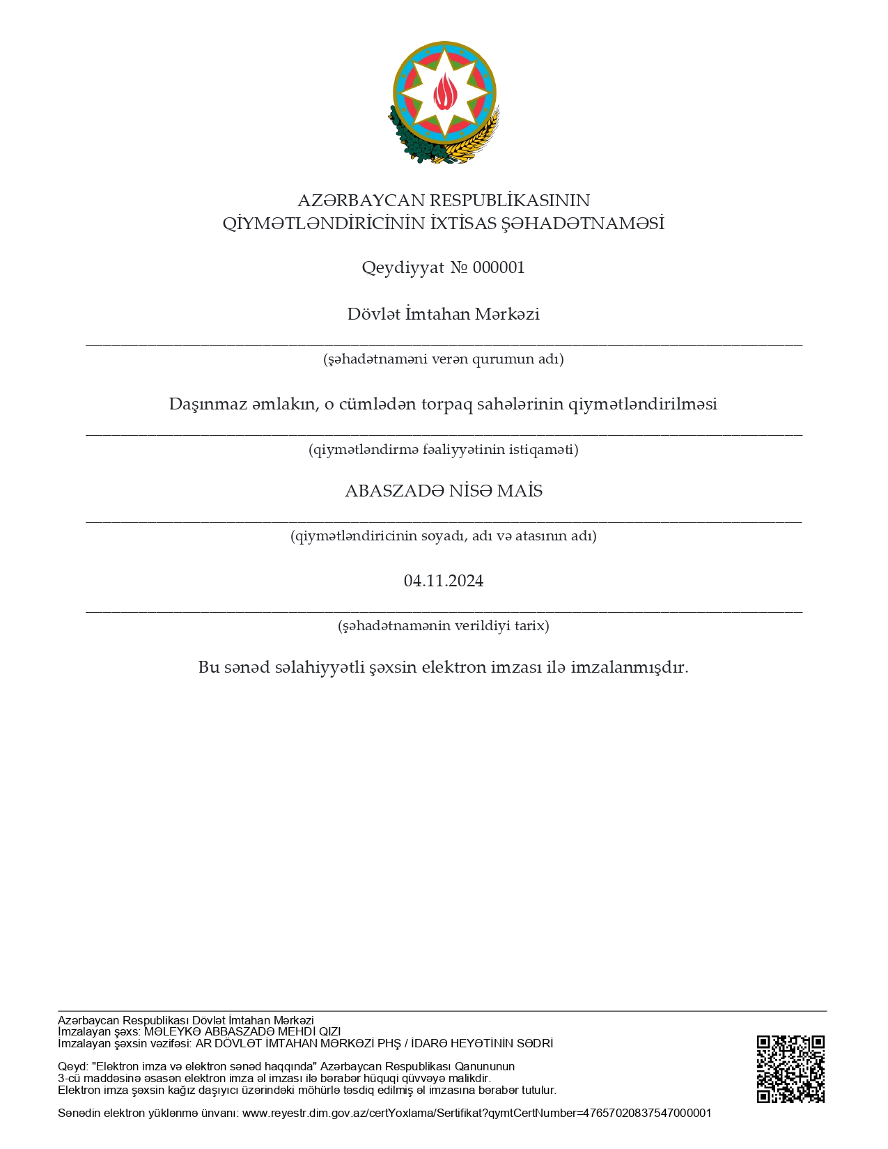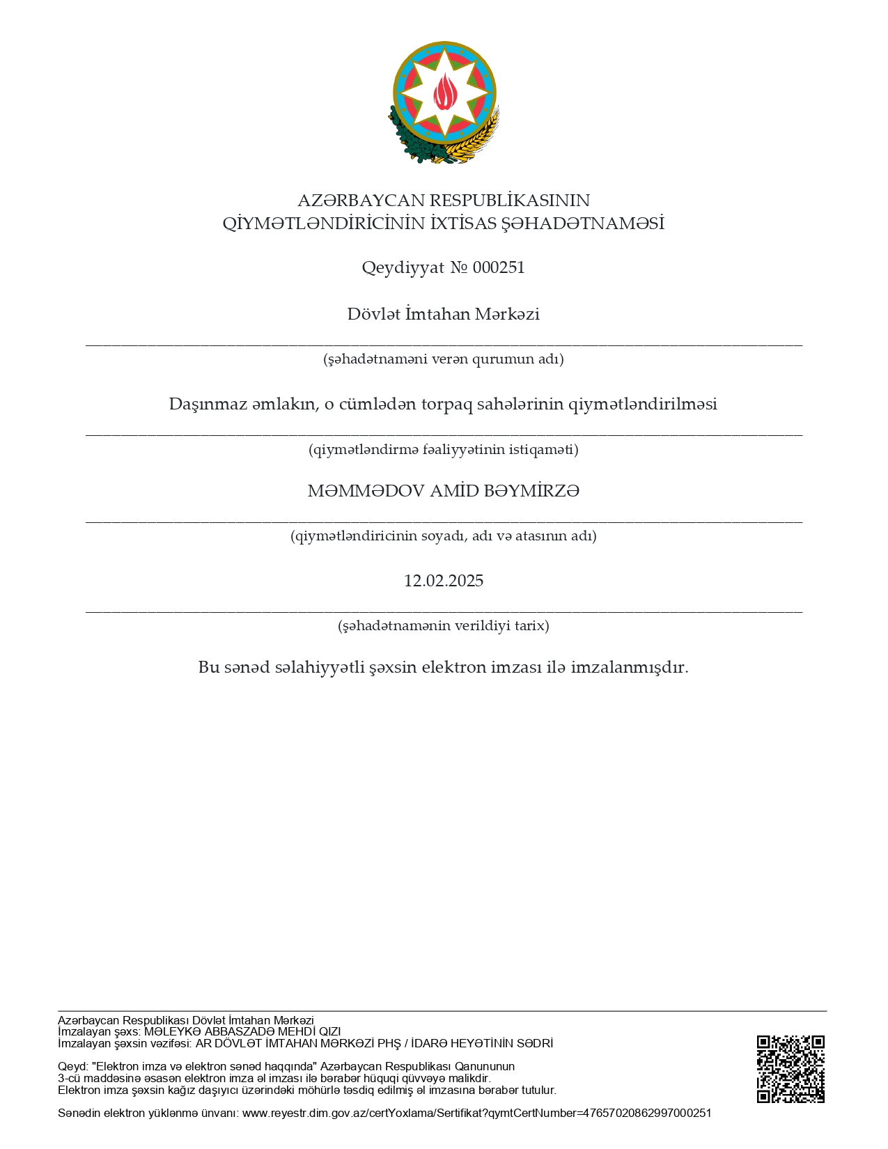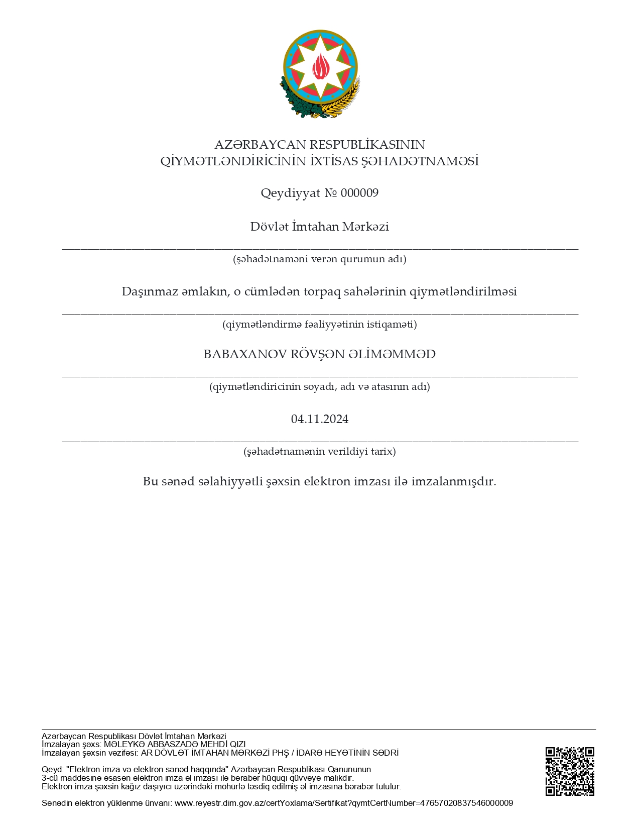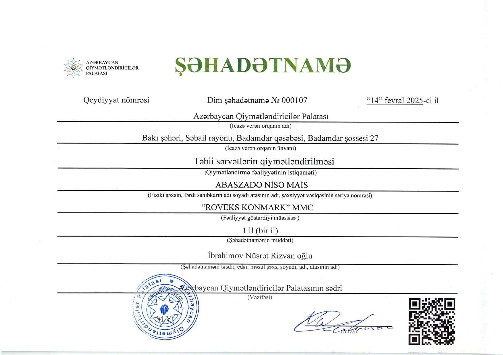 Bu gün mən şirkətin əməkdaşları ilə işgüzar münasibət qurmağa nail olmuşam, belə ki, Rovşan Babaxanovun yaxşı nəticələr ilə Beynəlxalq Maliyyə Korporasiyası və Azərbaycan Qiymətləndiricilər Cəmiyyəti tərəfindən keçirilmiş professional qiymətləndiricilərin sertifikatlaşdırmasından keçməsi onun professional qabiliyyətinin yüksək olmasının göstəricisidir. Eyni zamanda, BMK tərəfindən layihə çərçivisində işə cəlb olunan şirkətin əməkdaşı olan Əli Məmmədovun yüksək analitik və riyazi biliklərə malik olmasını nümayiş etditmişdir və layihənin işini modelləşdirmişdir. Sizə gələcək fəaliyyətinizdə uqurlar arzu edirəm.